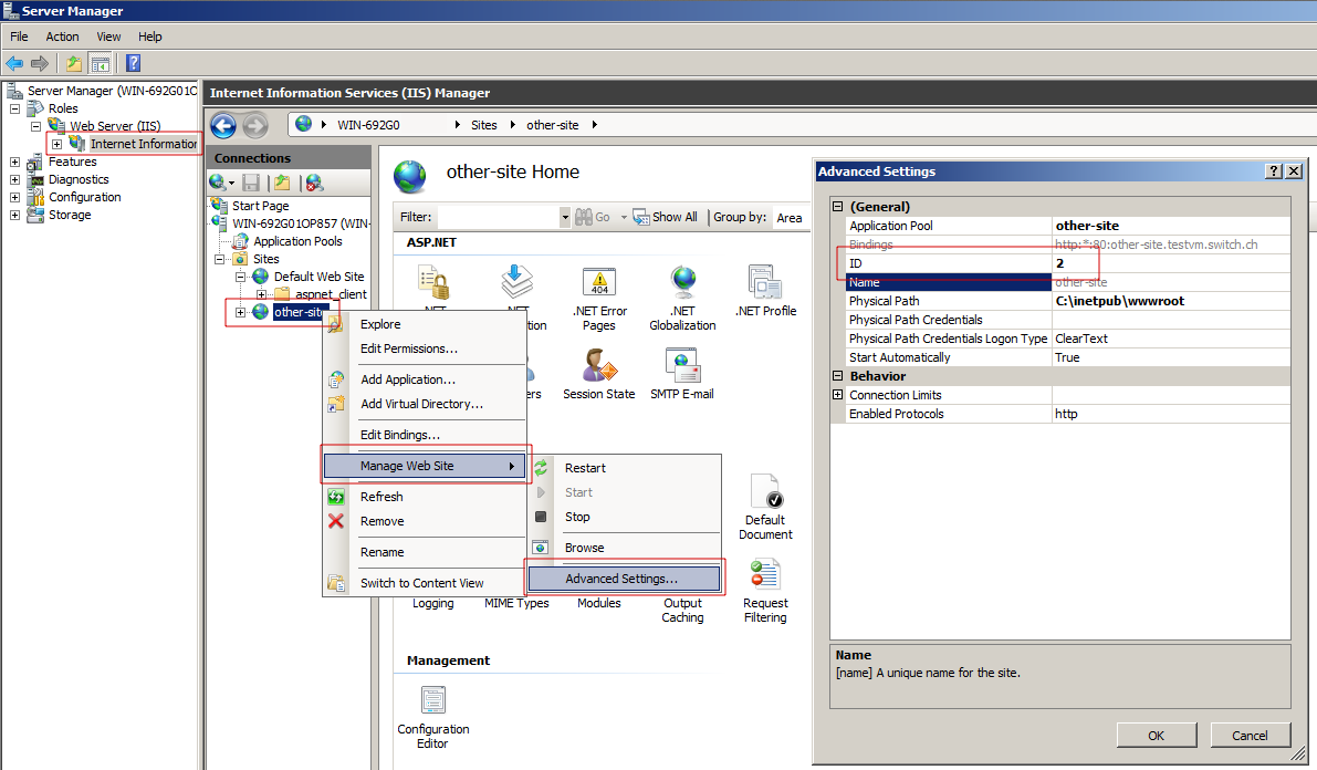 If you are using IIS with multiple sites, make sure to review the <Site> element and its id value. Shibboleth requires the site ID value. The site id for the default IIS Site is one 1, which is also the default value used in the Shibboleth configuration. For all other Sites, the site ID can be seen via the Site Advanced Settings